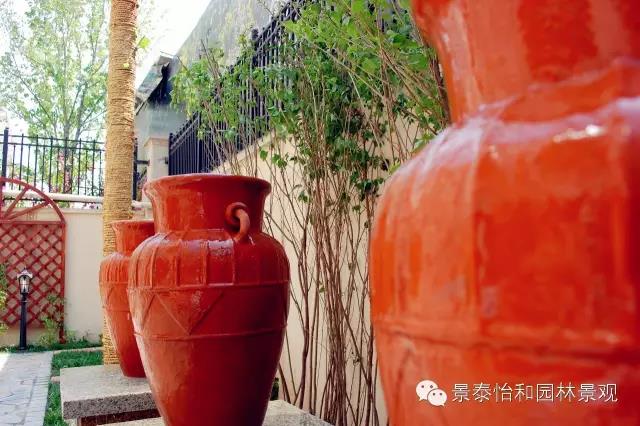 后院的空間開敞,為朋友聚會提供了場所。羅馬柱及陶罐的使用增添了庭院的歐式風情。